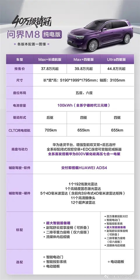 据悉,M8纯电一共提供三款配置,分为Max+长续航、Max+四驱和Ultra四驱,预售价为37.8万、39.8万和44.8万元。