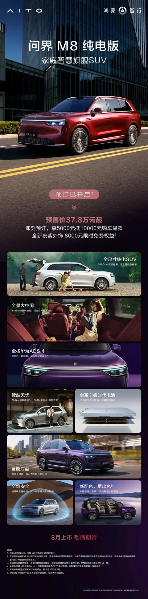 今日上午,问界M8纯电版开启预订,余承东表示这款车全系标配149升超大智能电动前备箱,全系100度宁德时时代电池,无混发。