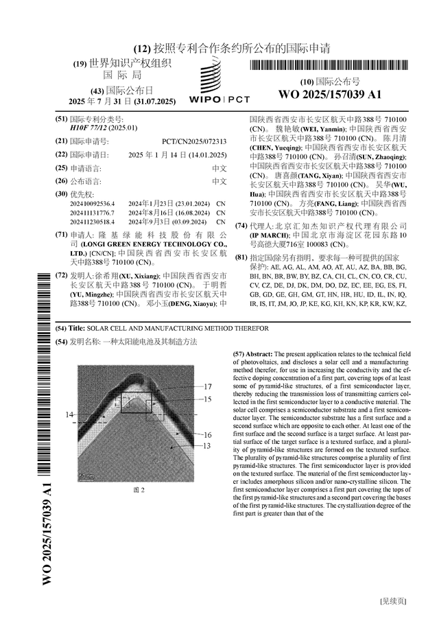 证券之星消息,根据企查查数据显示隆基绿能(601012)公布了一项国际专利申请,专利名为“一种太阳能电池及其制造方法”,专利申请号为PCT/CN2025/072313,国际公布日为2025年7月31日。