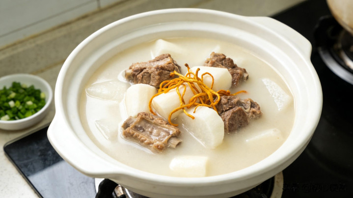 6. 1小时后放入山药块,继续焖煮20分钟,煮至山药软烂、排骨熟透。