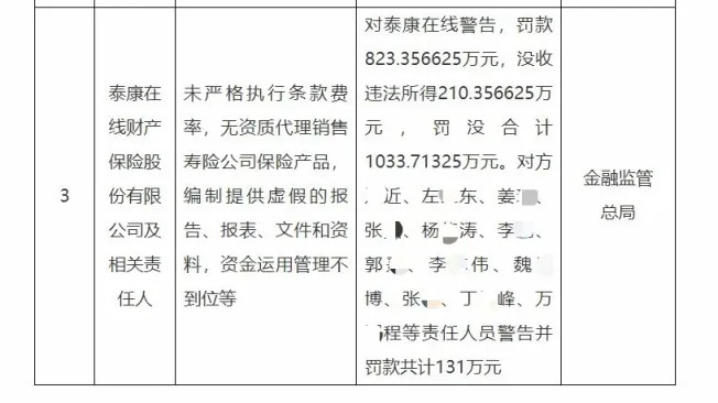 2024年1月,国家金融监督管理总局江苏监管局公布行政处罚信息显示,泰康在线因“未严格按照公司制度对合作渠道产品销售页面进行审核和自查;未按规定使用经备案的保险条款”,被警告并罚款11万元。