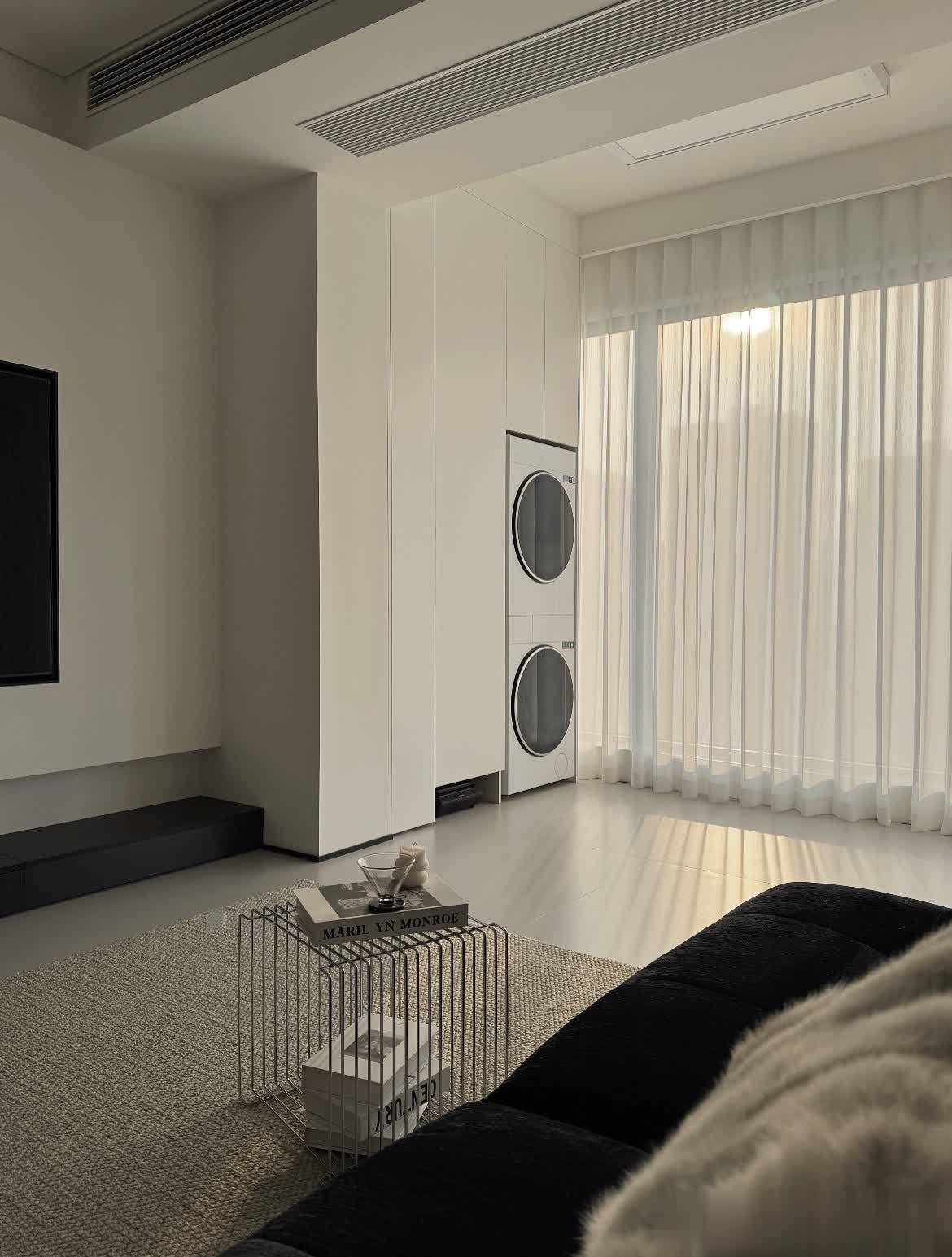 悬浮电视墙+隐形家政柜 整洁省空间,做悬浮式灯槽电视墙,底部留空+嵌入灯带,视觉轻盈抬高层高,灯光一开氛围瞬间拉满✨ 侧面柜体嵌入洗烘套装和洗地机,家政柜客厅一体,杂乱秒隐身,整洁感翻倍!