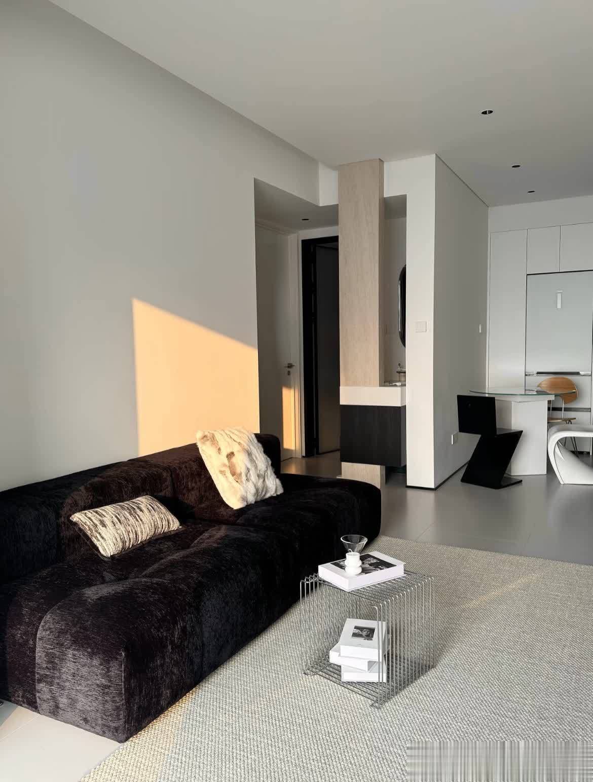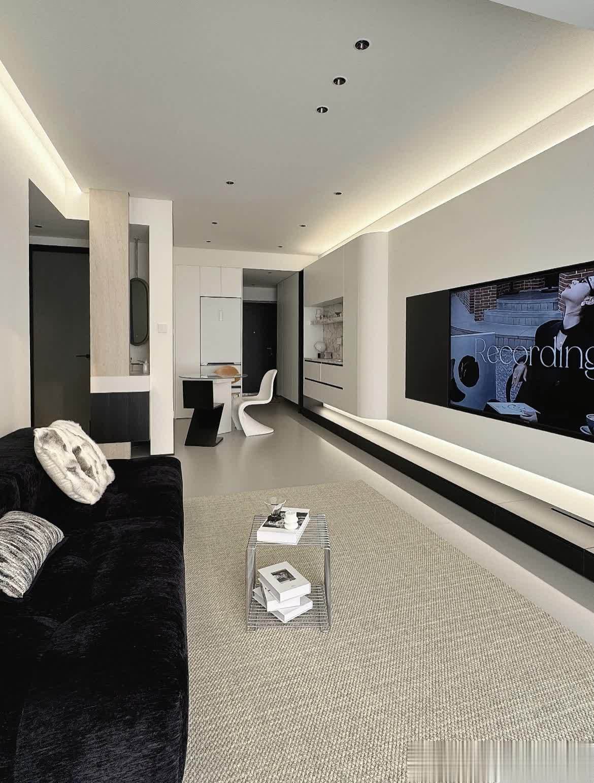 全屋无主灯+黑白极简,显大又高级 全屋取消主灯,采用筒射灯+氛围灯带组合,光线柔和显层高。墙面暖白漆配浅灰柔光砖,极简黑白配统一又有层次,小户型就这样视觉放大一圈!